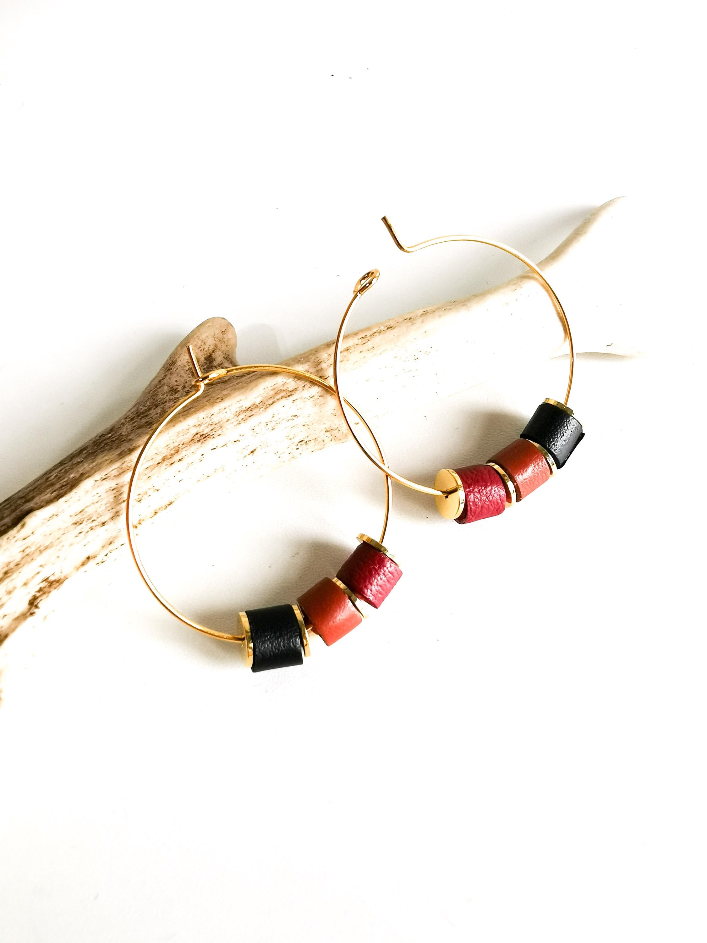PAIR OF GOLD BRASS HOOP EARRINGS - LEATHER BEADS - HANDMADE - BLACK TERRA COTTA RED BURGUNDY AND GOLD HEISHI