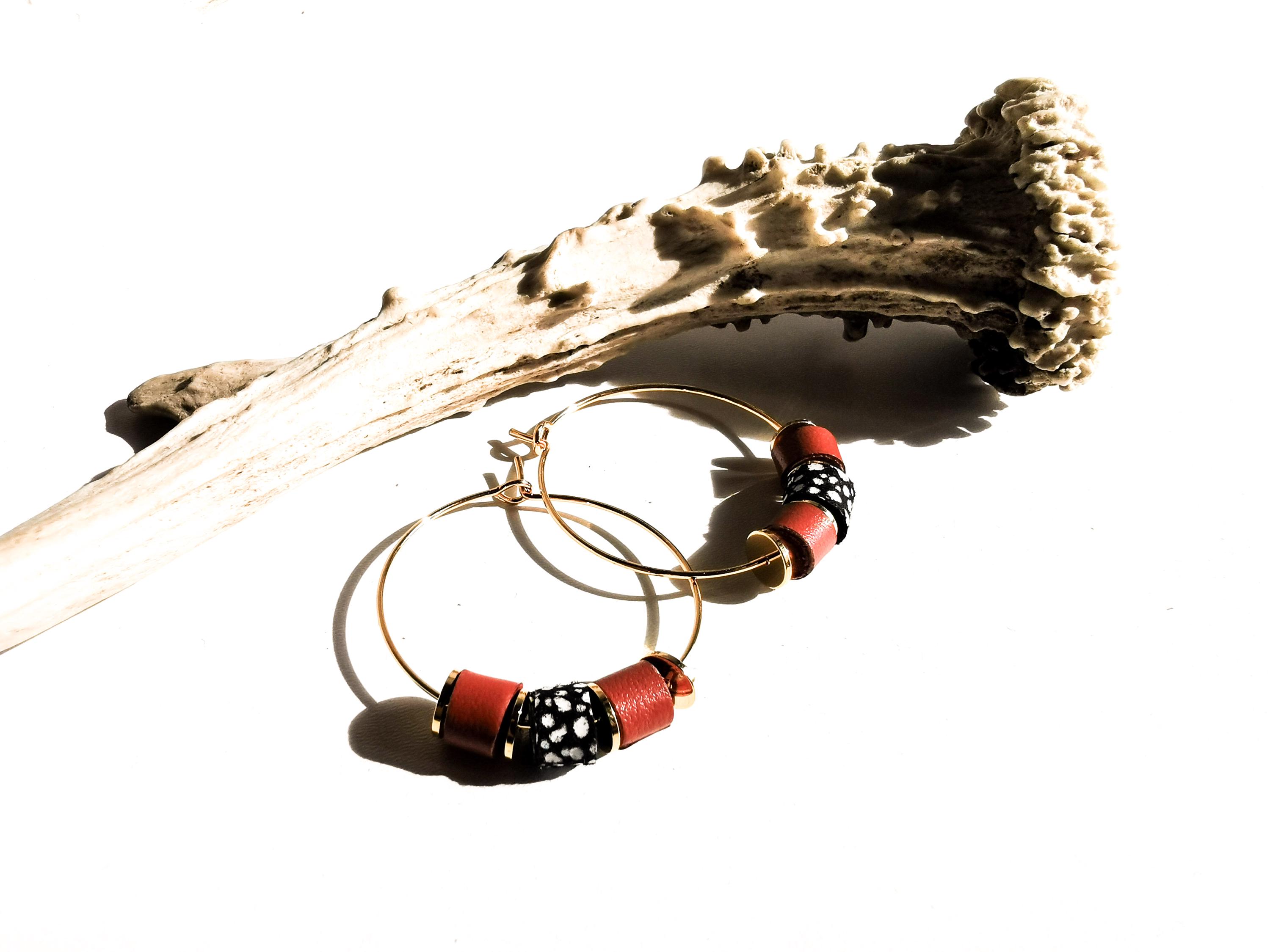 These hoop earrings are made with pretty leather beads combined with heishi beads and mounted on a gold-plated brass base.